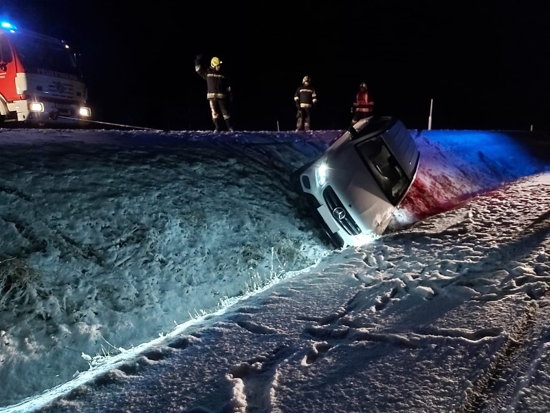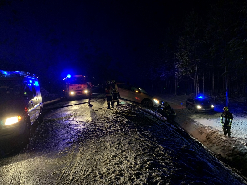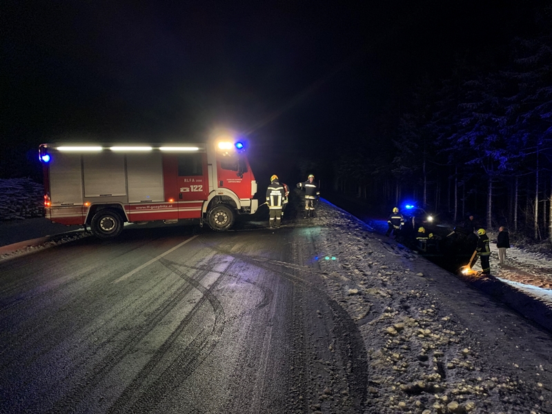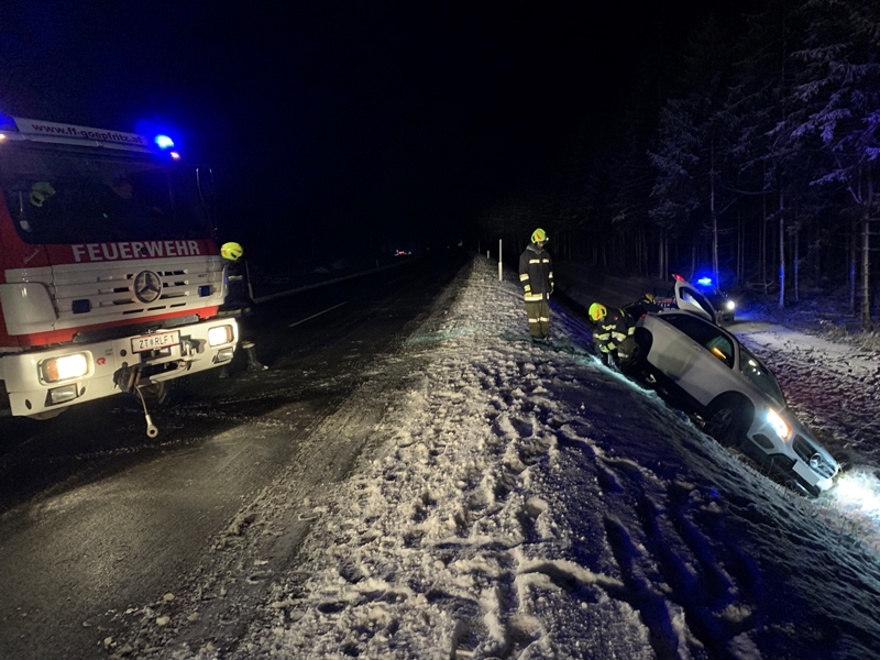 Ein Lenker kam aus bisher unbekannter Ursache von der Fahrbahn ab, fuhr eine steile ca. 4 m tiefe Böschung hinab und kippte nach dem Aufprall im Graben auf die Seite, wobei der Lenker glücklicherweise unverletzt blieb.