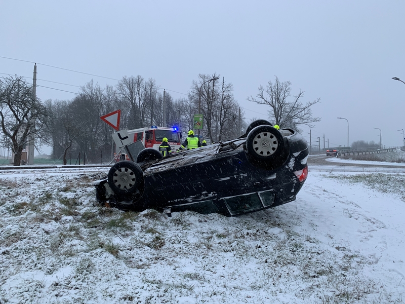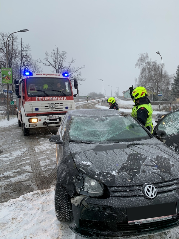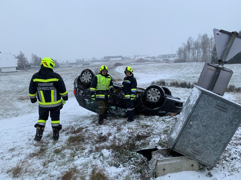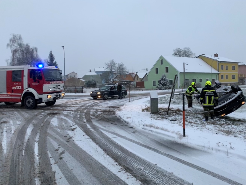 Die Lenkerin eines PKW´s war aufgrund der winterlichen Straßenverhältnisse mit dem PKW im Bereich der Kreuzung Raabserstraße/Bahnhofstraße von der Fahrbahn abgekommen und nach einem Überschlag und der Kollision mit einem Verteilerkasten auf dem Dach liegend in einer angrenzenden Wiese zum Stillstand gekommen.