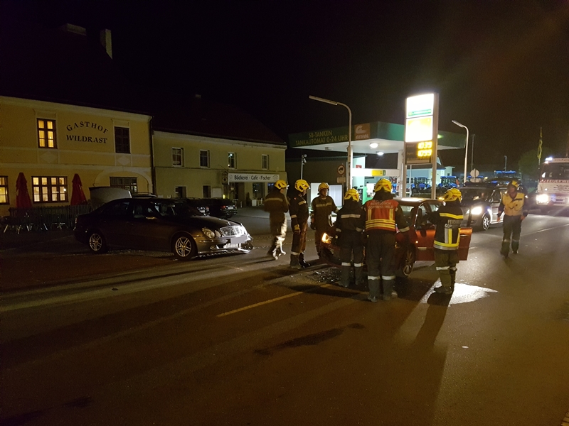 Zwei Fahrzeuge stießen auf der LB2 im Kreuzungsbereich vor dem Gasthaus Wildrast aus bisher unbekannter Ursache zusammen, dabei wurden beide Fahrzeuge stark beschädigt - verletzt wurde niemand.