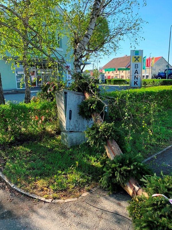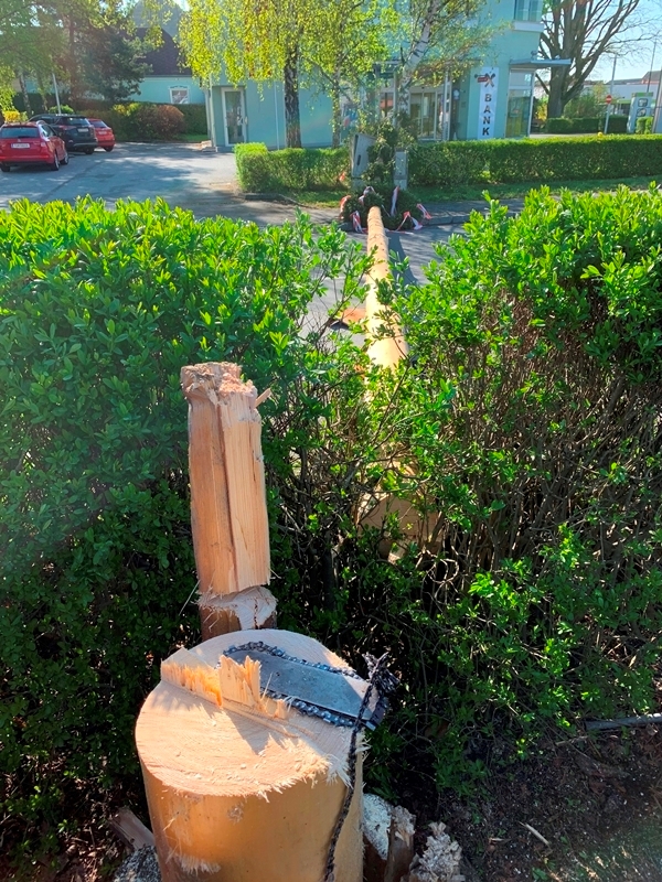 Ein misslungener Maistreich endete in einer sehr gefährlichen Situation für den Straßenverkehr und für die Umgebung rund um den Maibaum, da der Maibaum aufgrund des Einschnitts und des aufkommenden Windes unkontrolliert umstürzte.