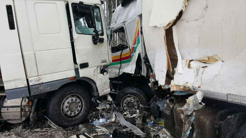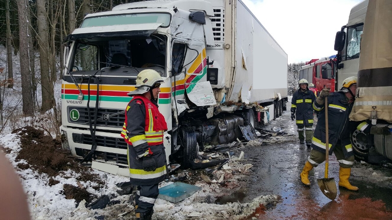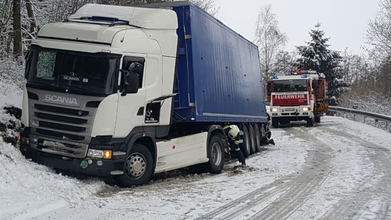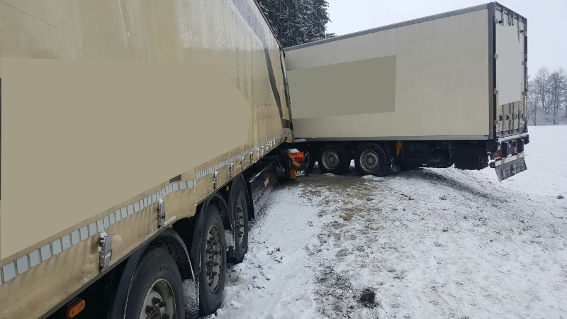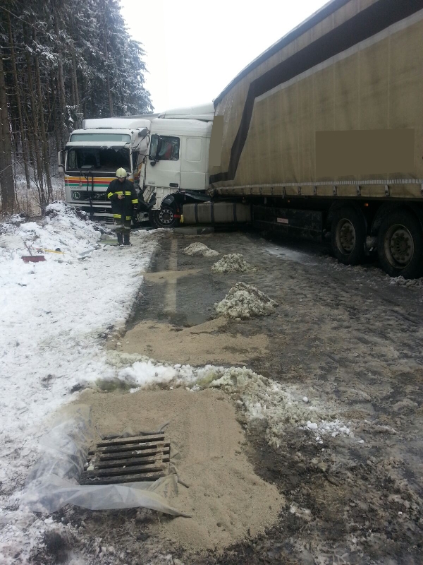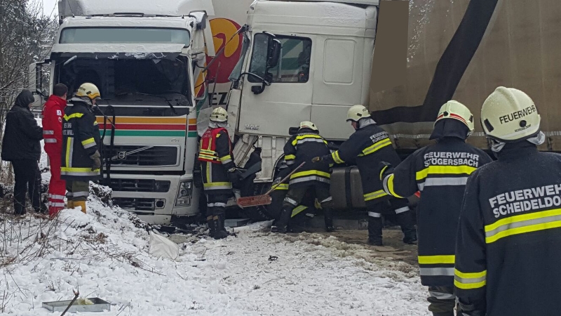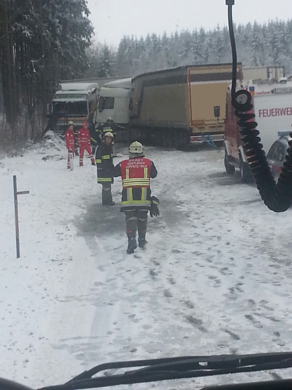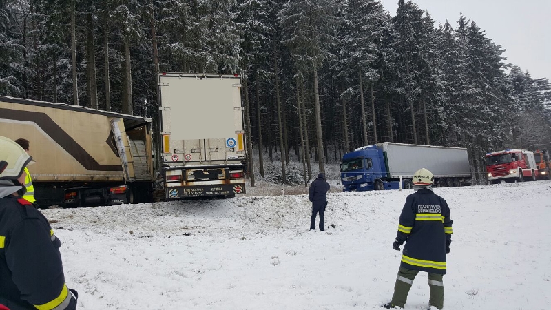 Drei LKW sind bei winterlichen Fahrbahnverhältnissen in diesen Verkehrsunfall verwickelt gewesen, wobei zwei LKW frontal zusammengestoßen sind und ein dritter LKW gegen eine Böschung fuhr.