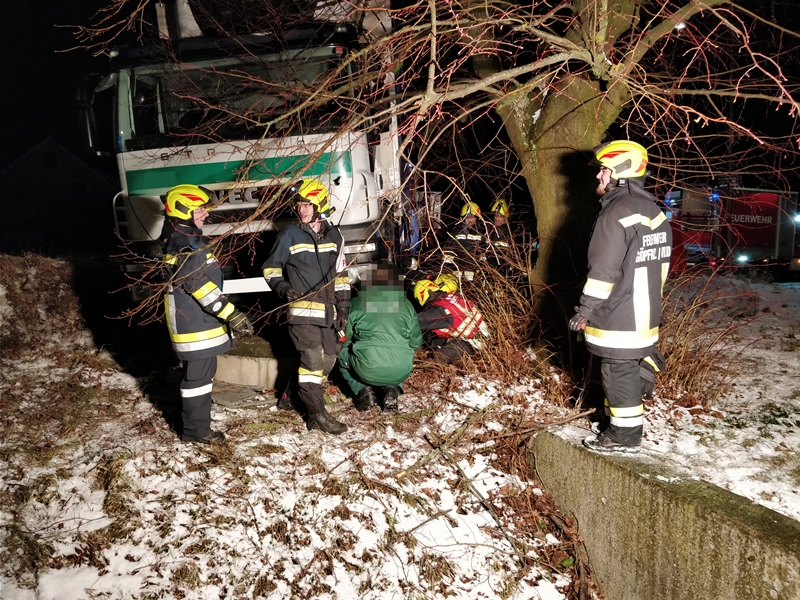 Auf der winterlichen Fahrbahn verlor ein LKW-Lenker die Kontrolle über seinen LKW und schlitterte anschließend in den angrenzenden Graben, wo er mit dem LKW auf auf einer Brunneneinfassung zum Stillstand kam.