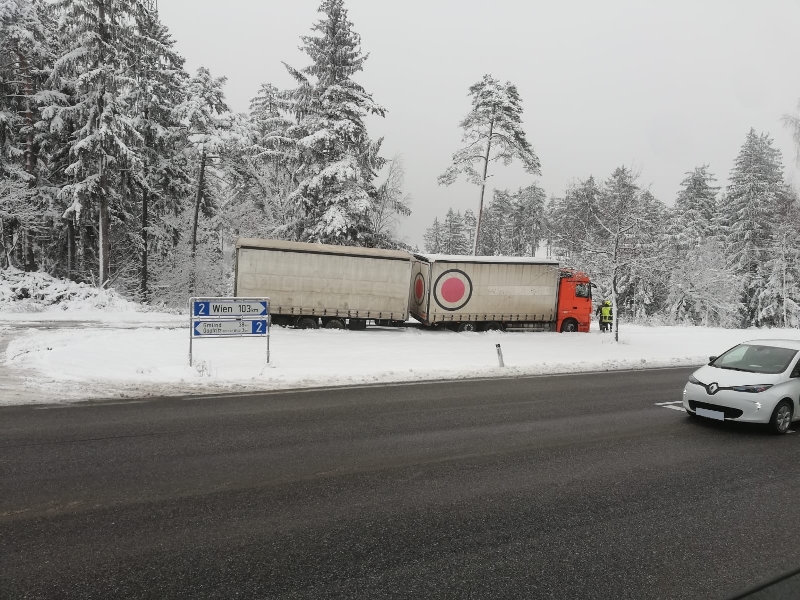 Beim Einfahren in den Begleitweg, der parallel zur LB2 verläuft, blieb ein LKW in den Schneemassen hängen und konnte nicht mehr vor oder zurück fahren.