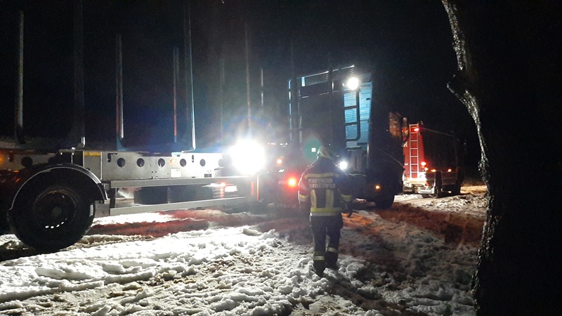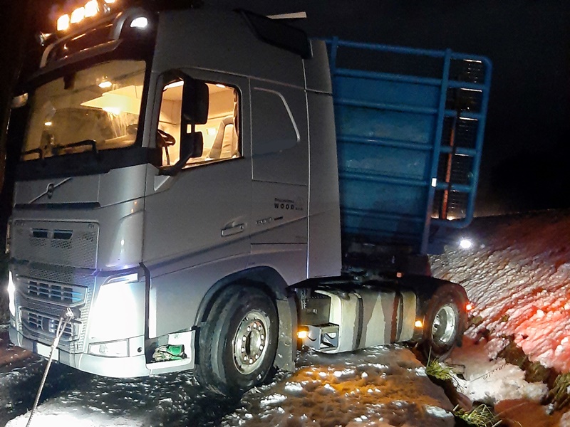 Ein Holztransporter geriet auf der schneeglatten Fahrbahn ins rutschen und blieb in weiterer Folge mit seinem Hinterreifen im Graben hängen.
