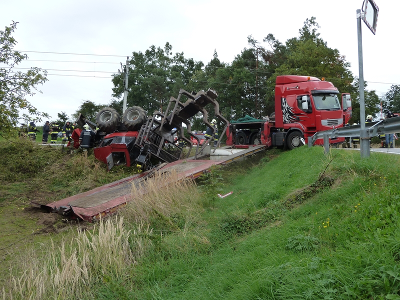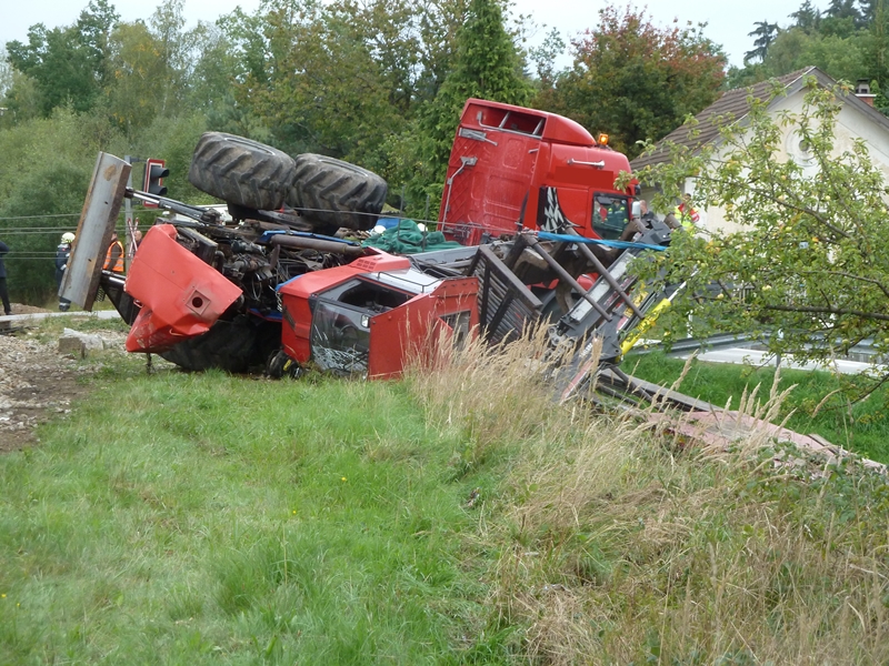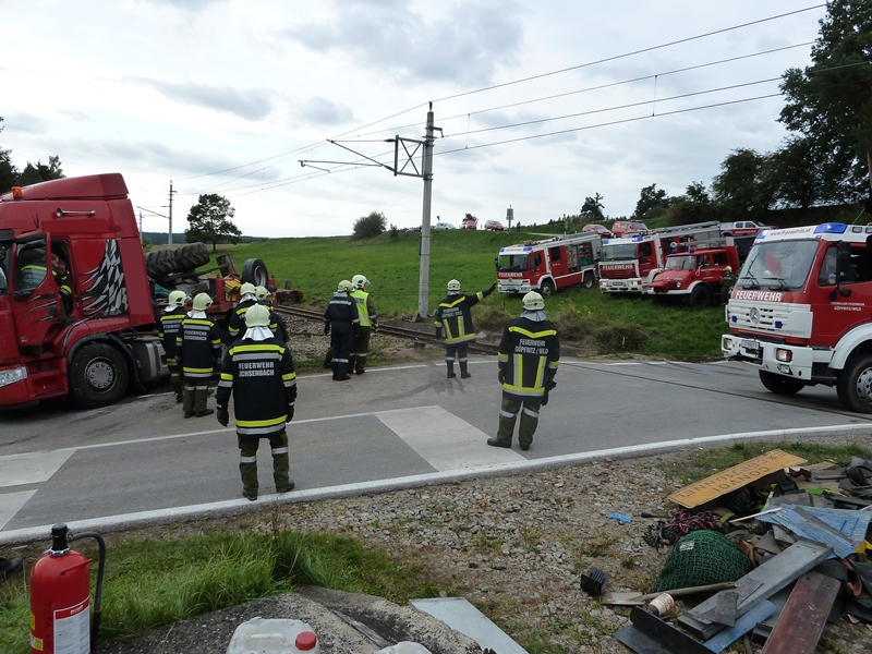 Der Fahrer eines mit einer Holzerntemaschine beladenen Sattelschleppers kollidierte am Bahnübergang bei Allentsteig mit einem aus Fahrtrichtung Wien kommenden Personenzug der Franz-Josef-Bahn.