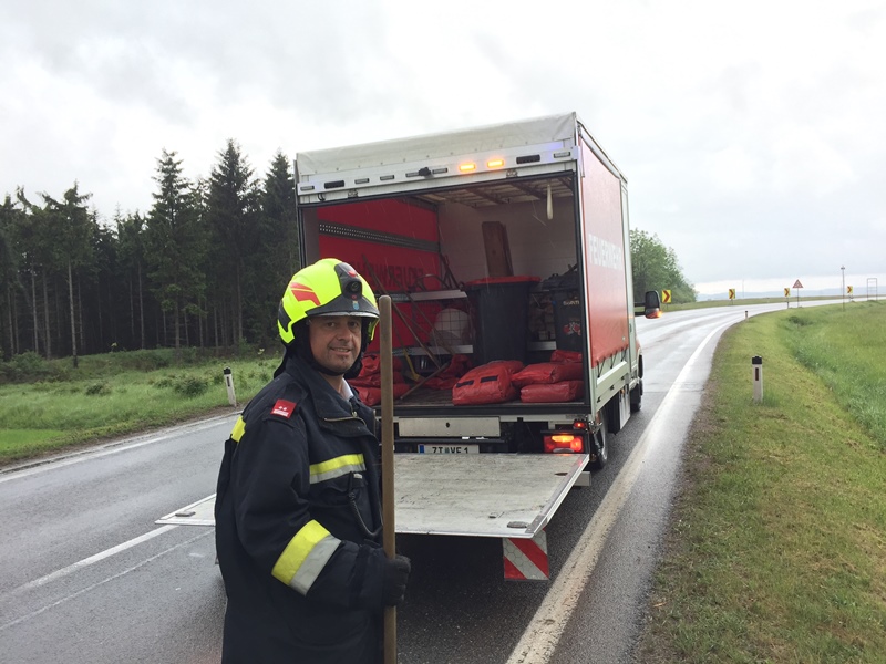 Da inzwischen sämtliche Feuerwehren an der LB4 bzw. in weiterer Folge an der LB2 von der LWZ alarmiert wurden, kümmerten sich die Kameraden von der FF Scheideldorf um die Dieselspur vom Kreisverkehr Allwangspitz in Richtung Scheideldorf. In mühevoller Handarbeit, die durch den strömenden Regen und die widrigen Wetterbedingungen erschwert wurde, wurde die Straße von dem Diesel-Wasser Gemisch gereinigt.