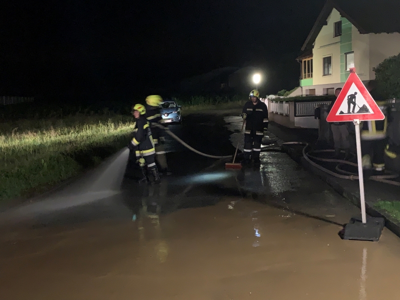 Abermals galt es den Wassereintritt in zwei Wohnhäuser im Bereich der Kreuzung Allwangweg # Brantenweg zu verhindern. Dies konnte unter der Zuhilfenahme von zwei Unterwasserpumpen erreicht werden und dadurch ein weiterer größerer Schaden verhindert werden. Gleichzeitig kam es wieder zu einer Überflutung der Unterführung. Ein Mitarbeiter des Bauhofes Göpfritz/Wild konnte die Störung des Pumpwerkes beheben und dadurch der Wasserstand reduziert werden. Aufgrund der vorhandenen Verschmutzung der Fahrbahn wurde vom Einsatzleiter die Straßenmeisterei informiert.
