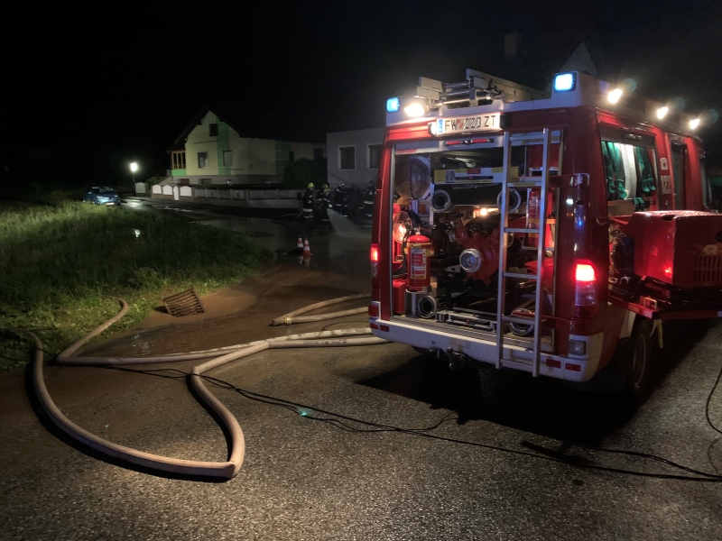 Parallel zu diesen Arbeiten kam es im Bereich der Kreuzung Allwangweg # Brantenweg zu einer Überflutung der Straße, in weiterer Folge drohte das Wasser in zwei Wohnhäuser einzudringen. Diese beiden Einsatzstellen übernahm die Besatzung des LFA. Mit mehreren Unterwasserpumpen konnte der Wasserstand relativ rasch gesenkt werden und ein weiteres Eindringen in die Wohnhäuser verhindert werden. Jenes Wasser das eingedrungen ist, wurde mittels Wasserschiebern aus den Häusern entfernt.
