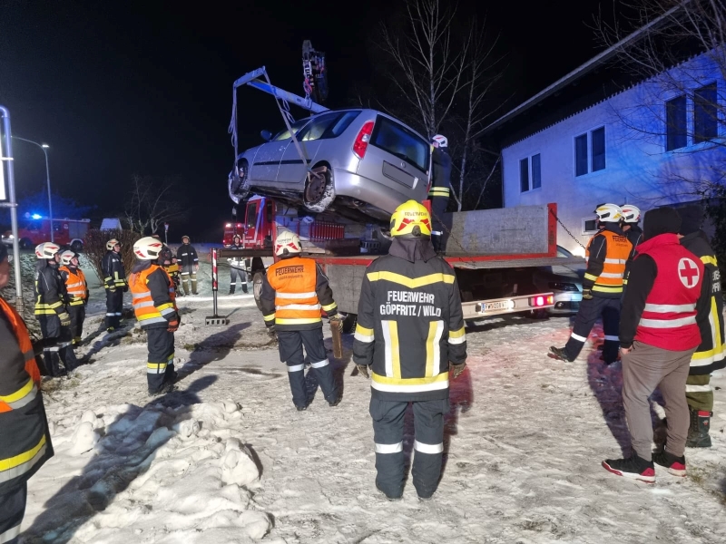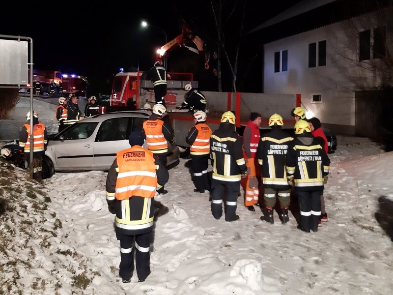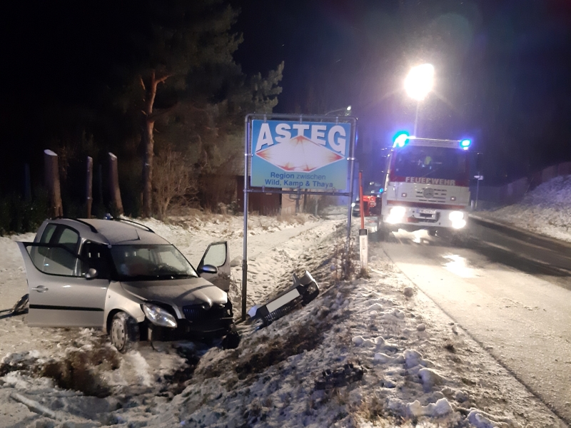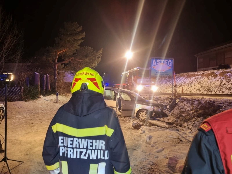 Ein PKW-Lenker kam von der spiegelglatten Fahrbahn ab, stieß in weiterer Folge gegen die Böschung und blieb verletzt im Fahrzeug sitzen.