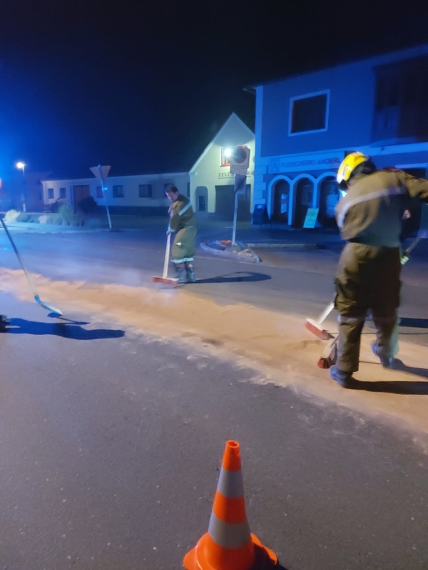 Um ca. 23:45 Uhr waren sämtliche Reinigungsmaßnahmen erledigt und die Einsatzkräfte konnten, nach Rücksprache mit dem Straßenerhalter und der Polizei wieder ins Feuerwehrhaus einrücken und die Einsatzbereitschaft wiederherstellen.
