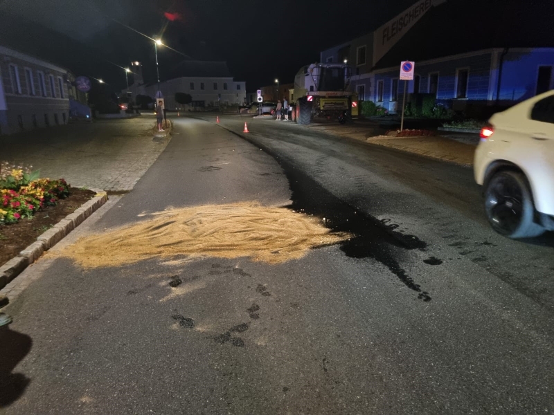 Ein Mähdrescher hat im Zuge einer Überstellungsfahrt aufgrund eines technischen Defekts große Mengen an Hydrauliköl verloren. Nachdem der Defekt nicht unmittelbar bemerkt wurde, war letztendlich die Hauptstraße/LB2 im Ortsgebiet von Göpfritz auf einer Länge von ca. 400m verunreinigt.