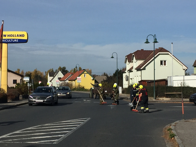 Nach der Absicherung der Einsatzstelle und dem wechselseitigen Vorbeilassen des Verkehrs konnte mit der Reinigung der Fahrbahn begonnen werden. Mit mehreren Straßenbesen und Schaufeln konnten so die Glasscherben von der Fahrbahn entfernt werden.