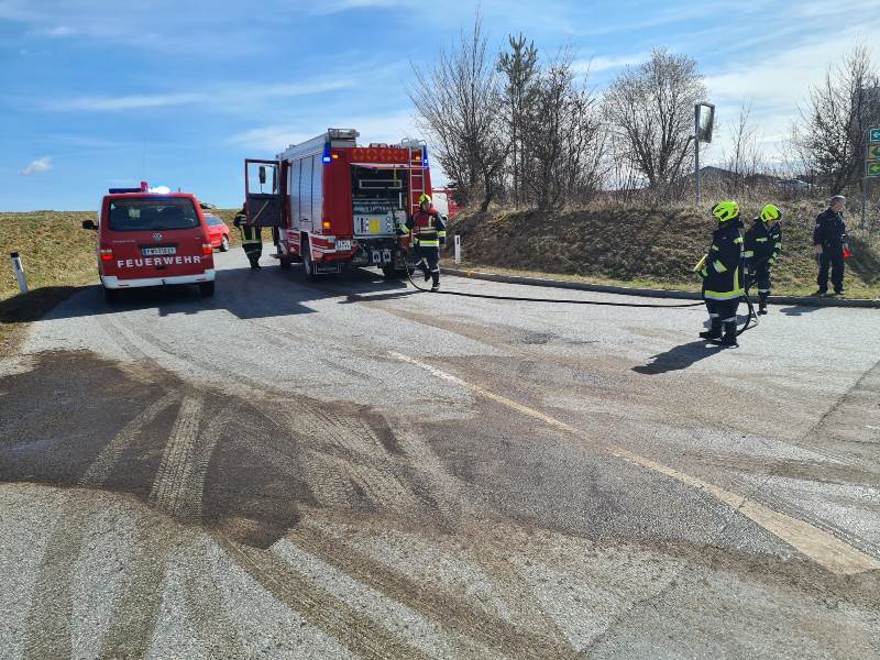 Ein Tanklastkrafwagen verlor Gülle, welche sich im Kreuzungsbereich der LB2 mit dem Betriebsgebiet auf der Fahrbahn verteilte und somit eine rutschige Gefahrenstelle für den vorbeifahrenden Verkehr bildete.