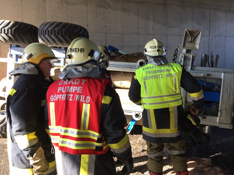Anschließend wurde mittels eines weiteren Rückewagens die Ladung des verunglückten Rückewagens umgeladen, damit dieser in weiterer Folge aufgestellt und von der Unfallstelle verbracht werden konnte.