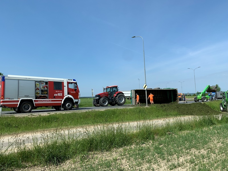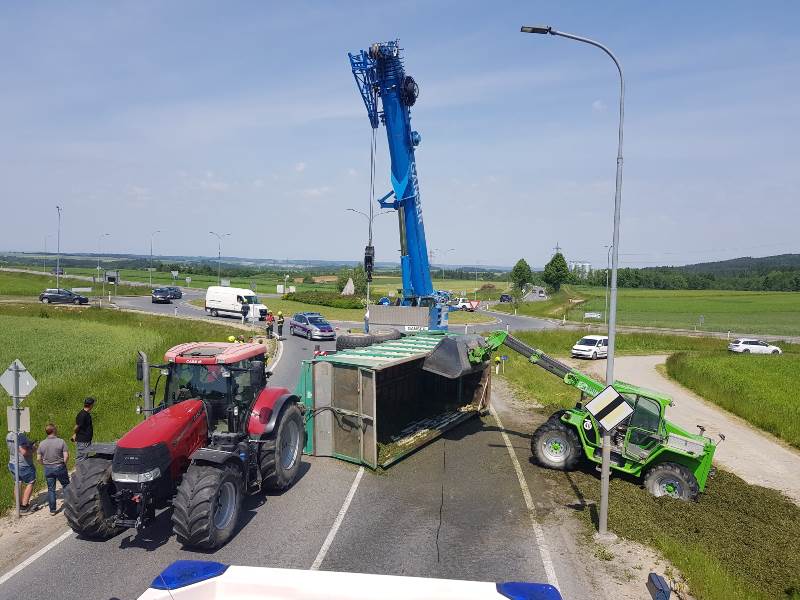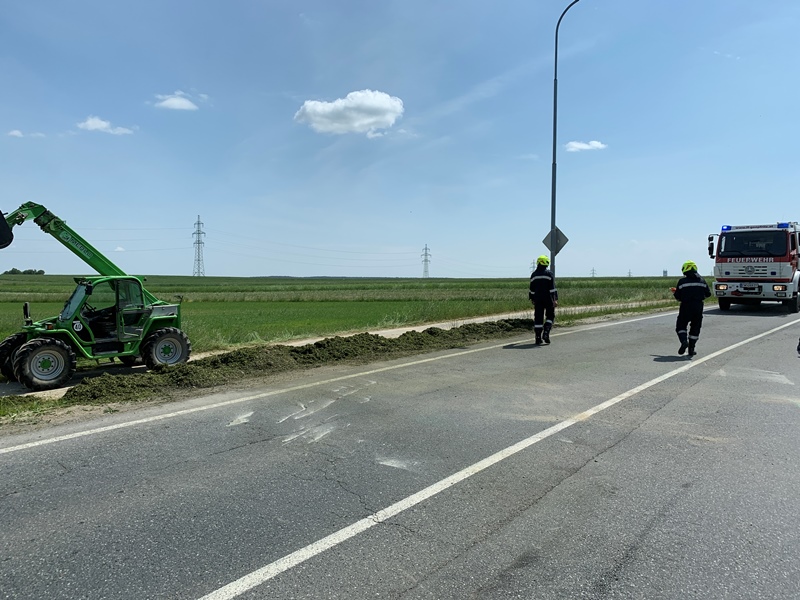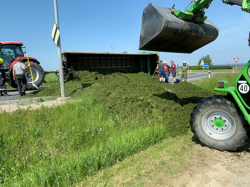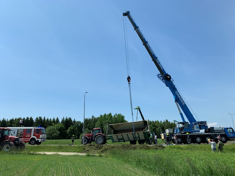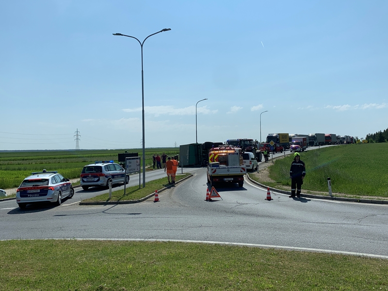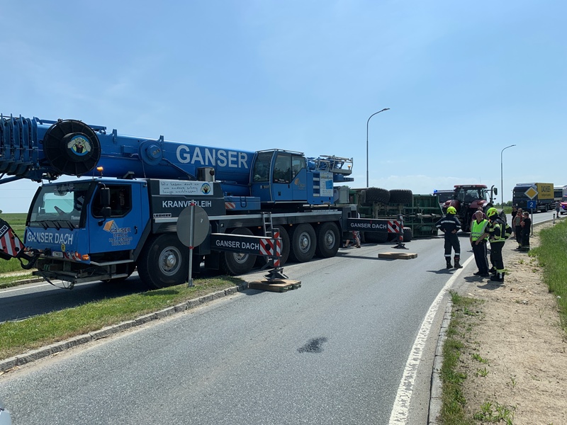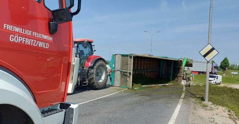 Aus bisher unbekannter Ursache stürzte während der Ausfahrt aus dem Kreisverkehr "Allwangspitz" der Anhänger eines Traktors um und blockierte in weiterer Folge beide Fahrspuren der LB2.