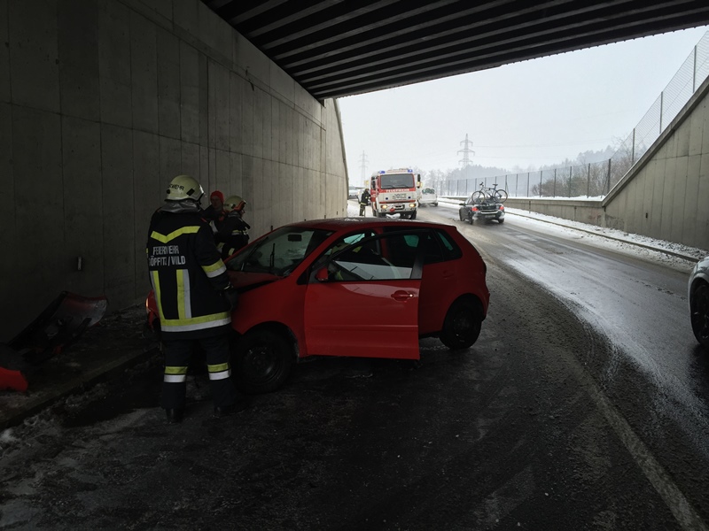 Eine Fahrzeuglenkerin ist bei winterlichen Fahrbahnverhältnissen mit ihrem Fahrzeug im Bereich der Bahnunterführung gegen eine betonierte Einfassung geschlittert und anschließend wieder auf die gegenüberliegende Fahrbahn geschleudert worden, wo sie dann auch zum Stillstand gekommen ist.