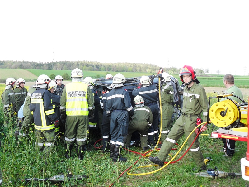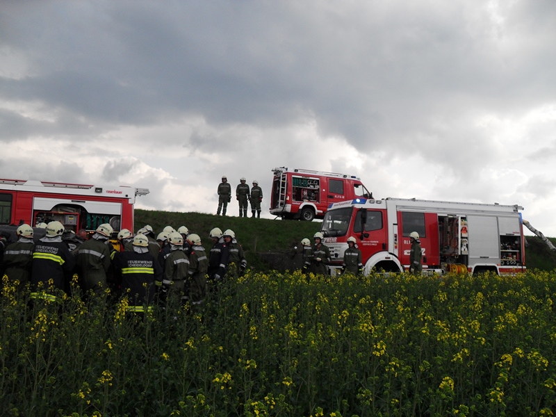Aufgrund der Alarmierung, dass eine Person im Fahrzeug eingeklemmt ist, wurden neben der örtlich zuständigen Feuerwehr Scheideldorf auch die Feuerwehren Göpfritz/Wild und Weinpolz alarmiert.
