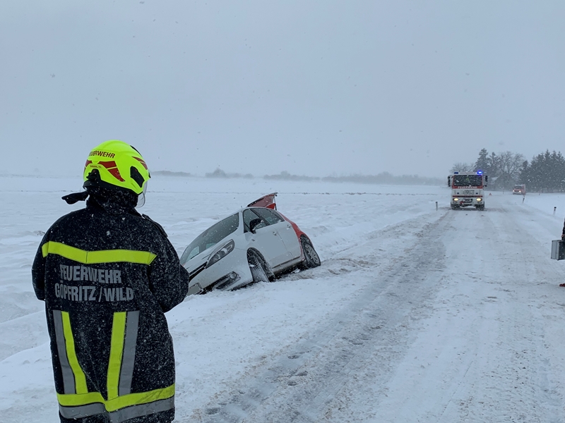 Ein PKW Lenker kam auf der schneeglatten Fahrbahn - trotz geringer Geschwindigkeit - bei Gegenverkehr von der Straße ab und blieb im Graben stecken.