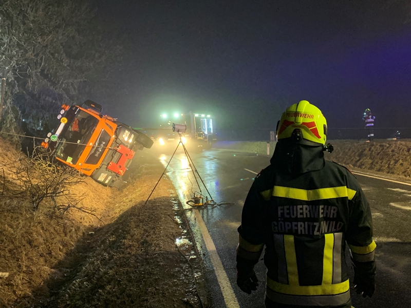Ein Streuwagen kam trotz niedriger Geschwindigkeit in einer abschüssigen Kurve auf der spiegelglatten Fahrbahn ins Rutschen und landete im angrenzenden Graben, wobei glücklicherweise niemand verletzt wurde.