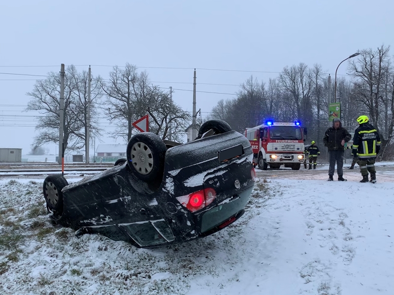 Die Lenkerin eines PKW´s war aufgrund der winterlichen Straßenverhältnisse mit dem PKW im Bereich der Kreuzung Raabserstraße/Bahnhofstraße von der Fahrbahn abgekommen und nach einem Überschlag und der Kollision mit einem Verteilerkasten auf dem Dach liegend in einer angrenzenden Wiese zum Stillstand gekommen.