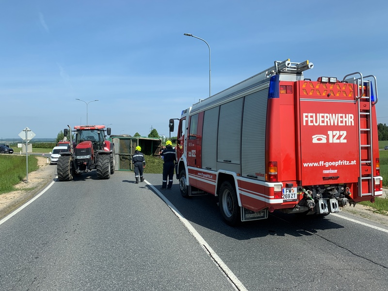 Aus bisher unbekannter Ursache stürzte während der Ausfahrt aus dem Kreisverkehr "Allwangspitz" der Anhänger eines Traktors um und blockierte in weiterer Folge beide Fahrspuren der LB2.