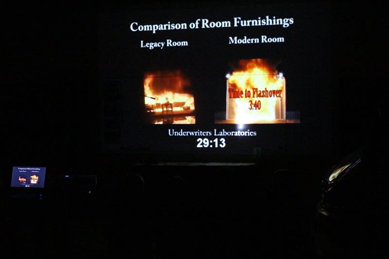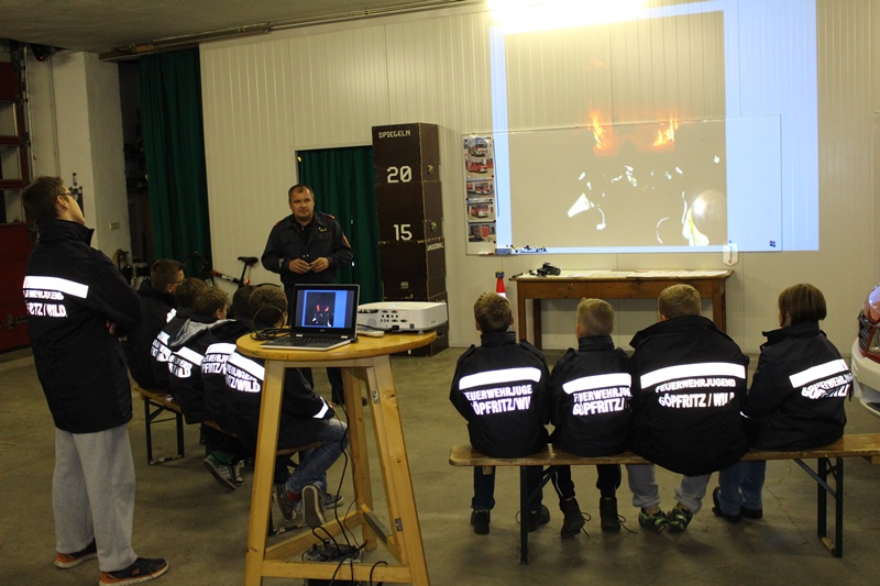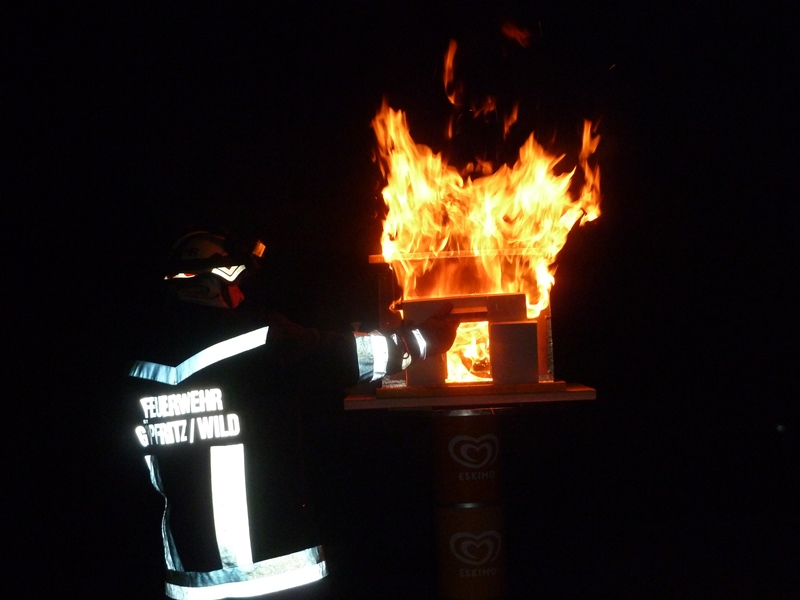 Um ca. 21.00 Uhr folgte dann der erste Ausbildungsschwerpunkt. LM Ronny Kuschal erklärte den Feuerwehrjugendmitgliedern die beiden Szenarien „Backdraft“ und „Flashover“ Nach einer kurzen Theorieeinheit konnte man das zuvor Erlernte in der Praxis, an einem kleinen Modell, erkennen und sehen.