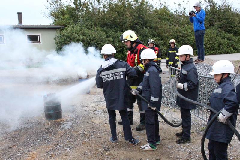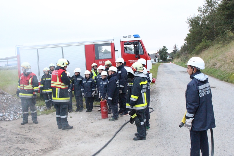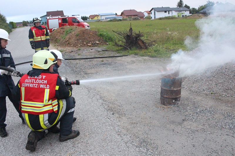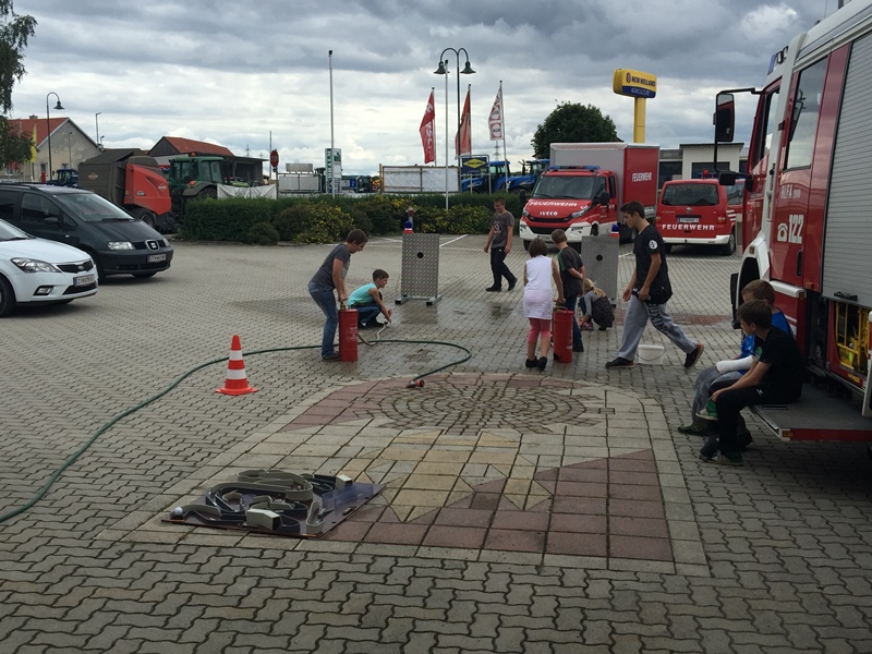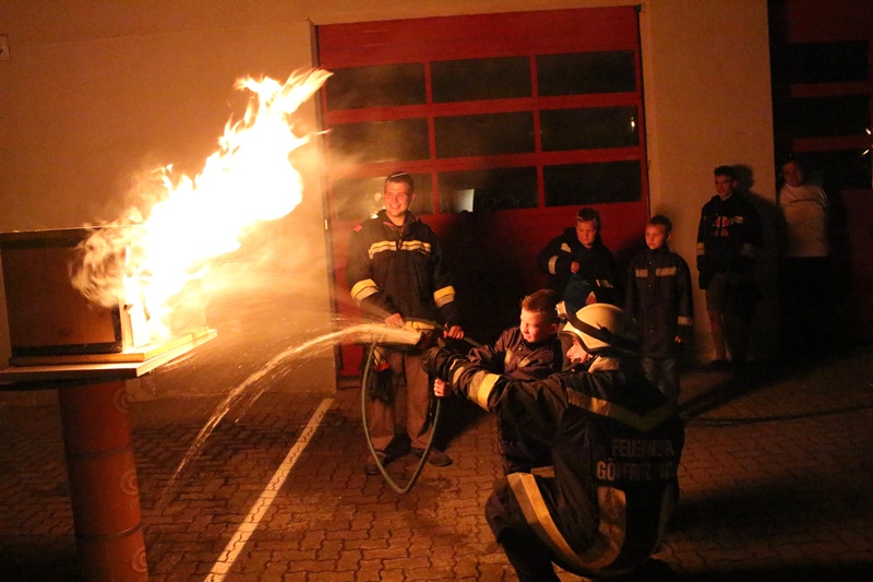 Mit mehreren „Feuerpatschen“ konnte schnell das Feuer gelöscht werden und in weiterer Folge mit einem Hohlstrahlrohr nachgelöscht werden. Zum Abschluss dieses Einsatzes wurde den Feuerwehrjugendmitgliedern das „Hydroschild“ sowie der „Wasserwerfer“ gezeigt.