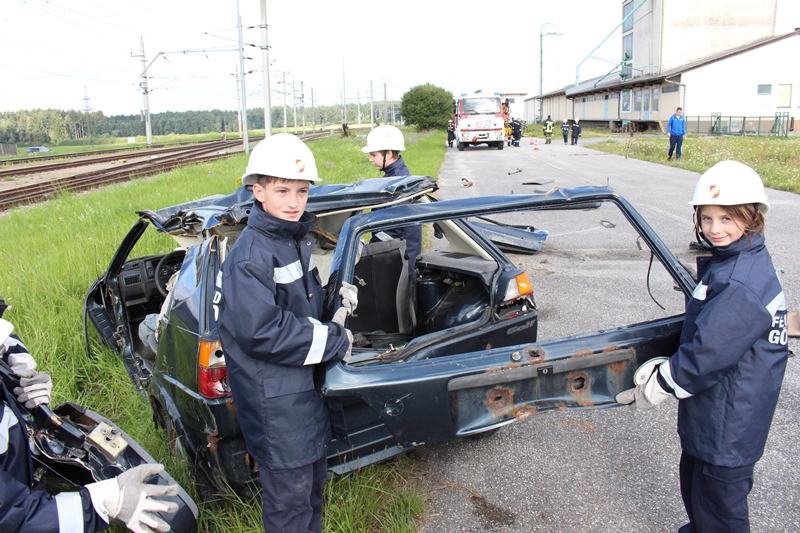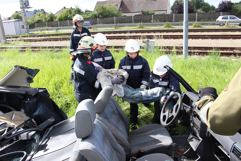 Bereits um 09.15 Uhr wurden die Jugendfeuerwehrmitglieder zum nächsten Übungseinsatz alarmiert. Auf der Übungsstraße (ehem. LB2 im Bereich Lagerhaus) rutschte ein PKW in den Graben. Bei der Ankunft entdeckte man, dass sich noch eine verletzte Person im Fahrzeug befand. Gemeinsam konnte man die Person aus dem Fahrzeug retten und im sicheren Bereich in die stabile Seitenlage bringen.
