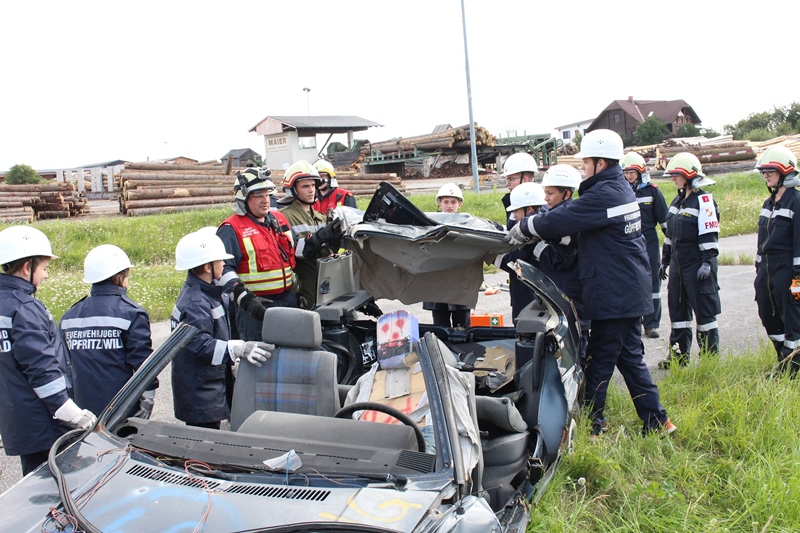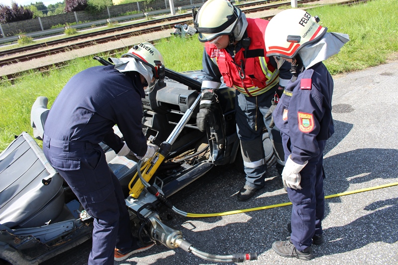 Um den PKW aus dem Graben ziehen zu können, musste, größtenteils von den Jugendlichen alleine, ein Greifzug mit Freilandverankerung aufgebaut werden, um den PKW auf die Fahrbahn zurückziehen zu können. Als besonderes Highlight durften sie anschließend, unter Aufsicht aktiver Feuerwehrkameraden, mit dem „Hydraulischen Rettungsgerät“ arbeiten und auch in diese Tätigkeit hineinschnuppern.