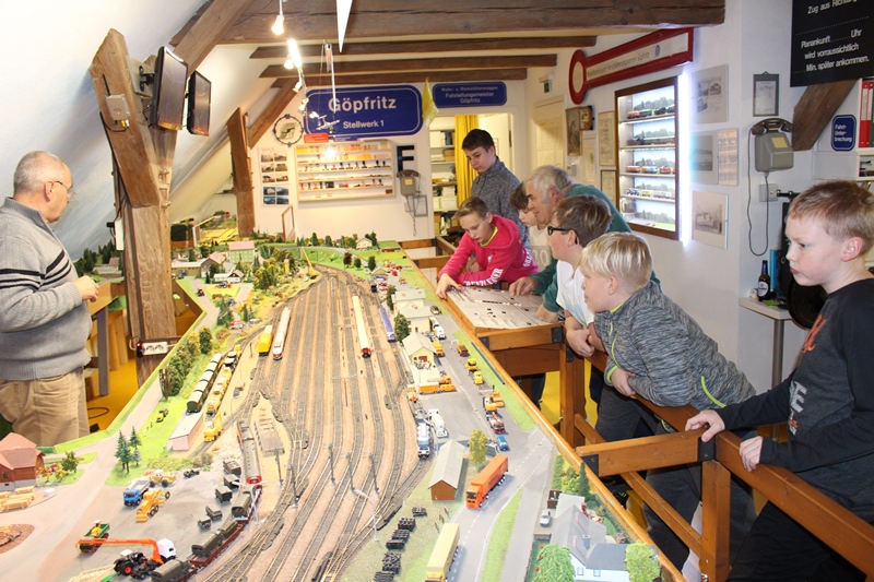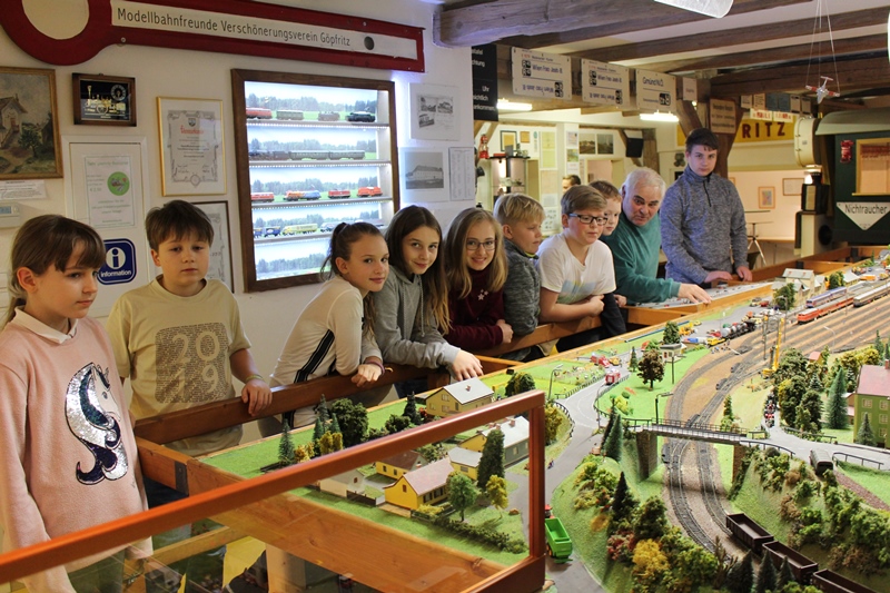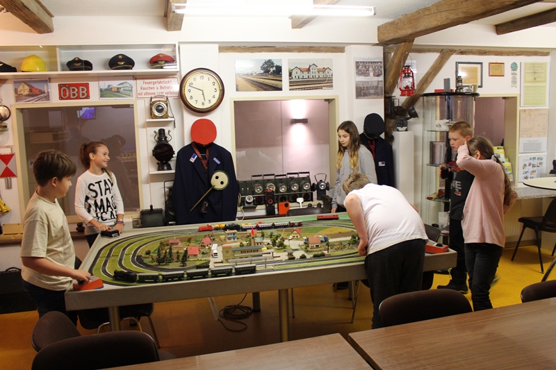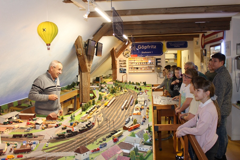 Unter der Führung von EHLM Wolfgang Schneider und Leopold Klein, die von Beginn an am Bau der Anlage maßgeblich beteiligt sind, konnten die Jugendlichen spannende und interessante Informationen über die Anlage, aber auch generell über das Thema "Eisenbahn in Göpfritz/Wild" erfahren. Ebenso konnten die Jugendlichen viele Kleinigkeiten und neue Funktionen der Anlage beobachten.