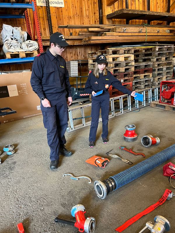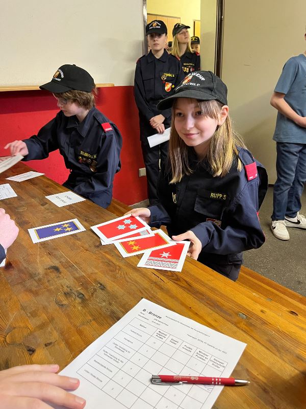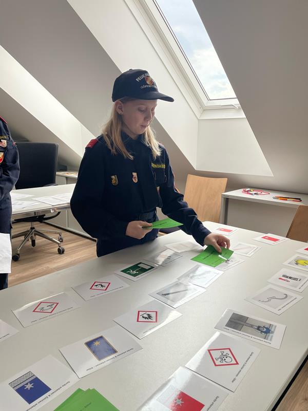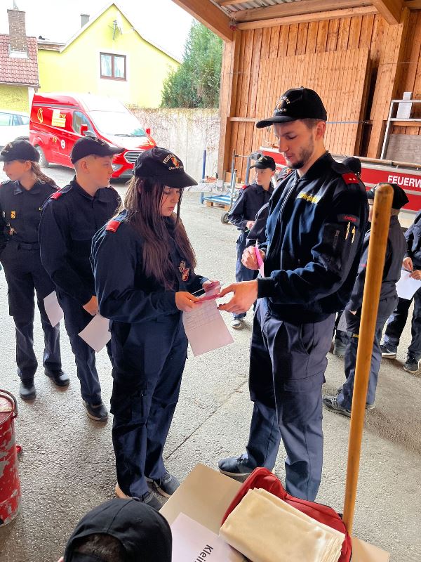 Ebenso mussten die Feuerwehrjugendmitglieder auch ihr Wissen über die persönliche Schutzausrüstung, die Warn- und Alarmsignale und dem richtigen Verhalten bei verschiedenen Gefahrensituationen unter Beweis stellen.